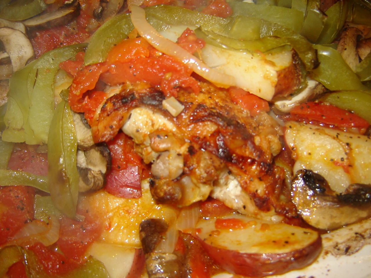 Place Chicken in skillet with little bit of olive oil. Sear both sides until golden brown. (chicken will still be raw) Chicken will cook fully once in baking pan in oven.